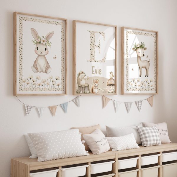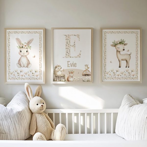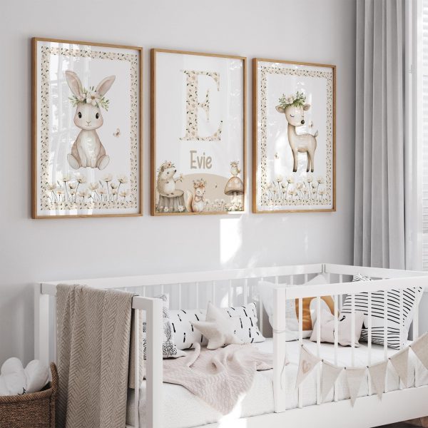 Create a calm and tranquil atmosphere in your little one’s nursery with this Cottagecore Girls Nursery Prints Set of 3. This adorable set features a bunny and deer surrounded by neutral toned florals, along with a personalised name print with more sweet animals adding the enchanting beauty of nature into your baby’s room. PRINTS: Our art prints are available in popular easy to frame sizes: 6 x 8 in A4 = 210 x 297mm | 8.25 x 11.7 in 8 x 10 in A3 = 297 x 420mm | 11.69 x 16.5 in (If you have a print size in mind that is not shown, please get in touch!)