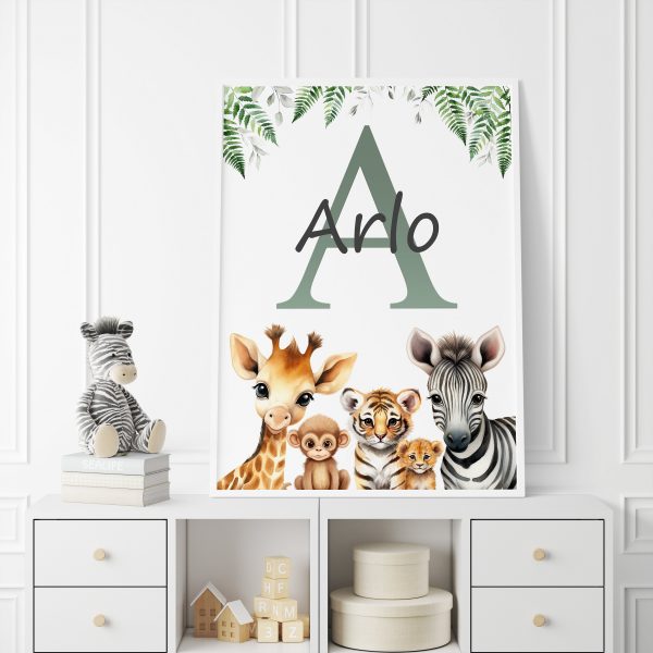 Add a touch of wild charm to your little one’s nursery or bedroom with this adorable Personalised Safari Animal Nursery Wall Print Set of 3! These premium quality prints feature a playful elephant, majestic lion, graceful giraffe, cheeky monkey, fierce tiger, and striped zebra, each adding a whimsical touch to the space. One of the prints showcases a large initial along with the little one’s name, surrounded by charming safari animals and lush foliage. Perfect for both boys and girls, these Kids Name Prints make for wonderful Boys Bedroom Decor or Baby Girl Animal Prints. Elevate the decor of your child’s room with these enchanting Kids Room Animal Pictures or brighten up their playroom with these delightful Animal Posters. Make a statement with this enchanting Safari Animal Print Set that is as unique and special as your little one!