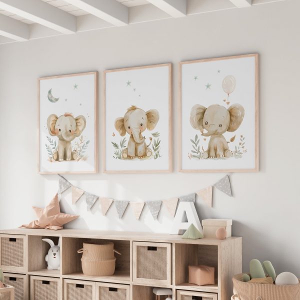 Elephant Nursery Wall Art Trio – Playroom Decor for Kids Set of 3