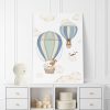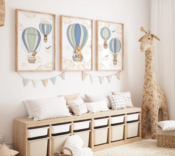 Hot Air Balloon Nursery Prints Green Blue with Woodland Creatures Transform your child’s space with this charming Set of 3 Hot Air Balloon Animal Nursery Prints with Clouds and Woodland Creatures!