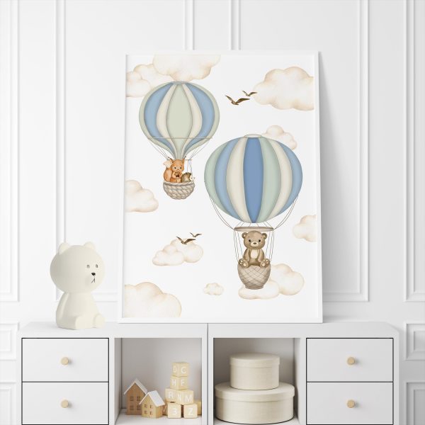 Featuring adorable woodland animals like a fox, deer, raccoon, bear, squirrel, bunny rabbit and hedgehog these prints create a whimsical atmosphere. Each piece showcases green blue air balloons gracefully floating among fluffy clouds, perfect for nursery wall decor or kids’ bedroom wall art. Ideal for playroom pictures, this enchanting collection adds warmth and imagination to any room for Baby Boy or Baby Girl.