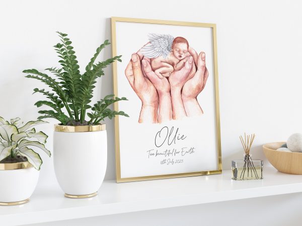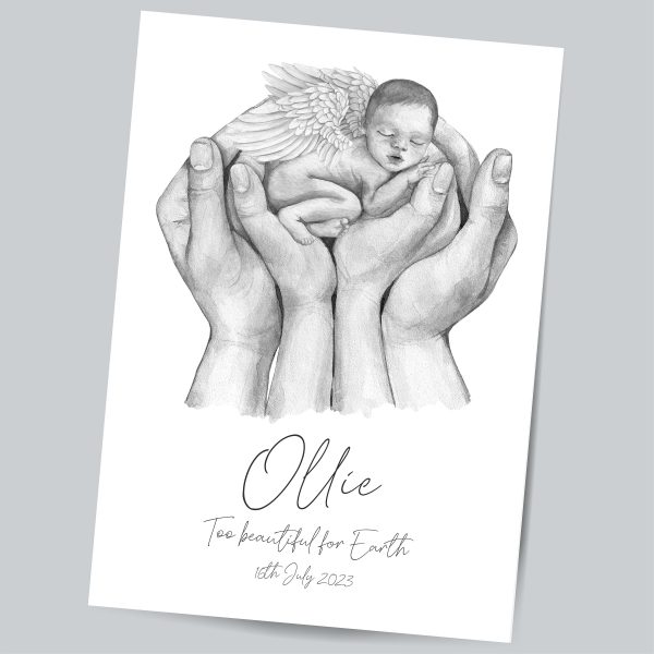 This beautiful watercolour illustration of tiny baby Angel sleeping peacefully in parents’ hands. A One-of-a-kind meaningful keepsake for pregnancies and births without the happy ending. This stunning print is available in 3 shades, from light to dark skin tones and one monochrome shade personalised with your own wording of choice. The print has the wording, ‘Fly high beautiful Angel’ with your personalisation, e.g., Baby’s Name & Date. If you would like an alternative choice of wording other than ‘Fly high beautiful Angel’, please make a note in the personalisation box. PRINTS Our art prints are available in popular easy to frame sizes: 8 x 6 inches A4 = 21 x 29.7cm | 210 x 297mm | 8.25 x 11.7 inches 10 x 8 inches A3 = 29.7 x 42cm | 297 x 420mm | 11.69 x 16.5 inches If you have a print size in mind that is not shown, please get in touch! There are lots of framing options for these sizes either online, in local stores and framing studios. They look amazing displayed in a mounted or poster style frame. To not limit your frame styling options, we choose to sell our artwork unframed.