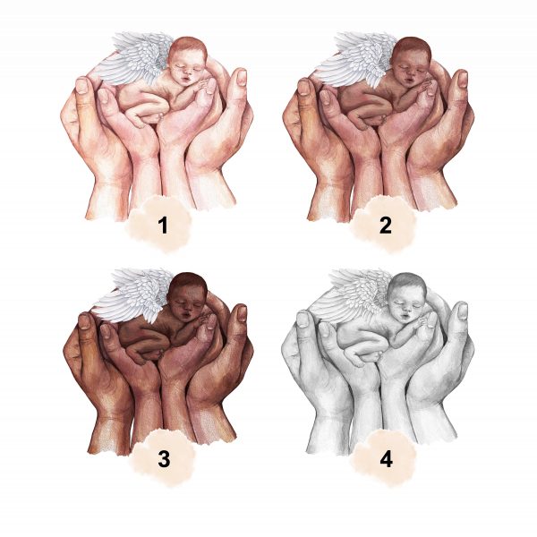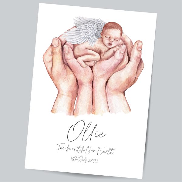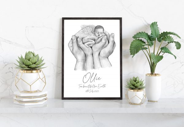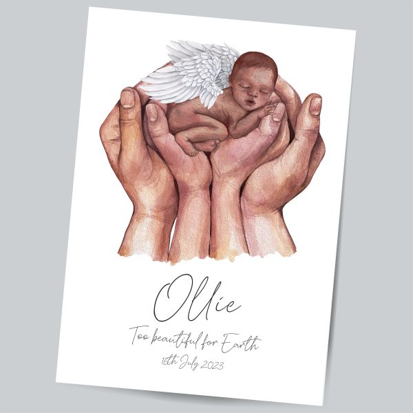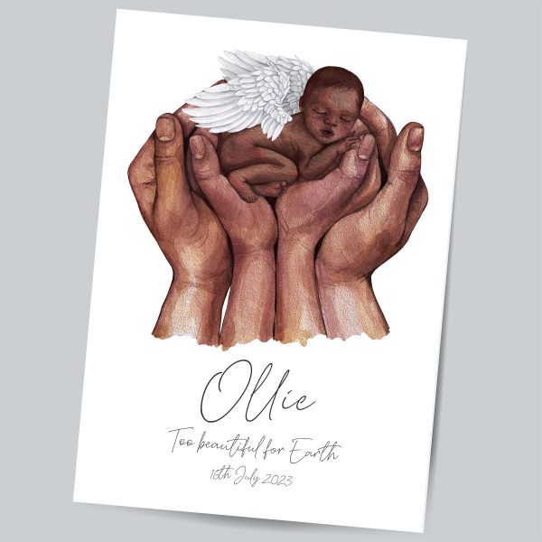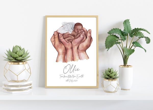 This beautiful watercolour illustration of tiny baby Angel sleeping peacefully in parents’ hands. A One-of-a-kind meaningful keepsake for pregnancies and births without the happy ending. This stunning print is available in 3 shades, from light to dark skin tones and one monochrome shade personalised with your own wording of choice. The print has the wording, ‘Fly high beautiful Angel’ with your personalisation, e.g., Baby’s Name & Date. If you would like an alternative choice of wording other than ‘Fly high beautiful Angel’, please make a note in the personalisation box. PRINTS Our art prints are available in popular easy to frame sizes: 8 x 6 inches A4 = 21 x 29.7cm | 210 x 297mm | 8.25 x 11.7 inches 10 x 8 inches A3 = 29.7 x 42cm | 297 x 420mm | 11.69 x 16.5 inches If you have a print size in mind that is not shown, please get in touch! There are lots of framing options for these sizes either online, in local stores and framing studios. They look amazing displayed in a mounted or poster style frame. To not limit your frame styling options, we choose to sell our artwork unframed.