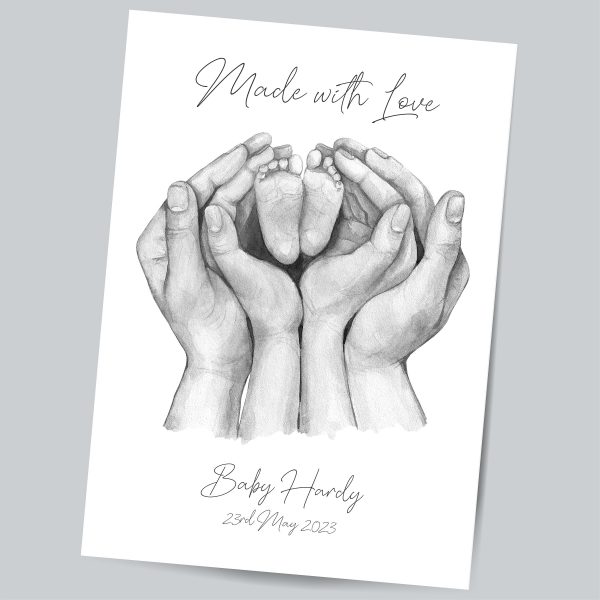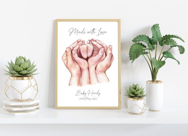 This adorable Personalised New Baby Print features a cute watercolour illustration of parents hands and new born tiny feet, little one’s name and birth date; the wording ‘Made with Love’, (if you have something else in mind please pop a message through to me). A One-of-a-kind meaningful keepsake for baby and perfect for New Parents.