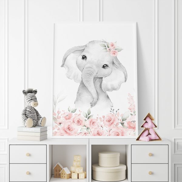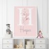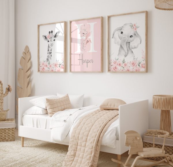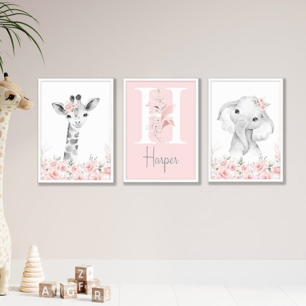 Personalised Girls Nursery Prints Set of 3 – Elephant, Giraffe & Initial with Florals.
