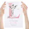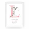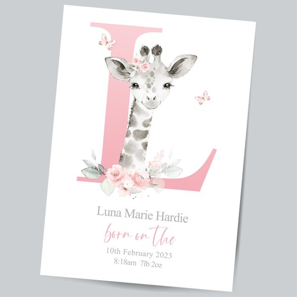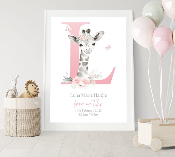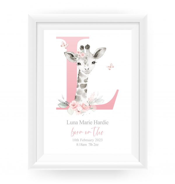 This adorable Personalised New Baby Girl Print features a cute watercolour illustration of a Baby Giraffe, a large pink Initial; butterflies; little one’s name and birth details, (if you have something else in mind please pop a message through to me). A One-of-a-kind meaningful keepsake for baby girl to celebrate entering the world! PRINTS: Our art prints are available in popular easy to frame sizes: 6 x 8 in A4 = 210 x 297mm | 8.25 x 11.7 in 8 x 10 in A3 = 297 x 420mm | 11.69 x 16.5 in (If you have a print size in mind that is not shown, please get in touch!) There are lots of framing options for these sizes either online, in local stores and framing studios. They look amazing displayed in a mounted or poster style frame. To not limit your frame styling options, we sell our artwork UNFRAMED.