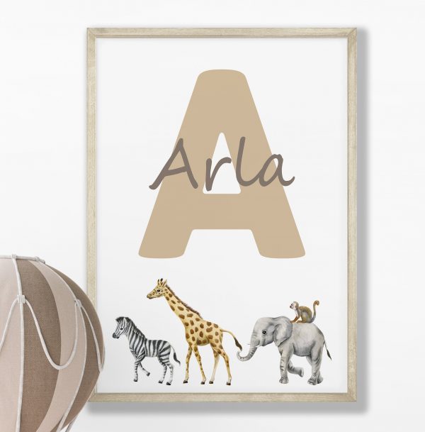 Personalised Safari Bedroom Art – Set of 3 Beige Prints with Name Initial and Animals
