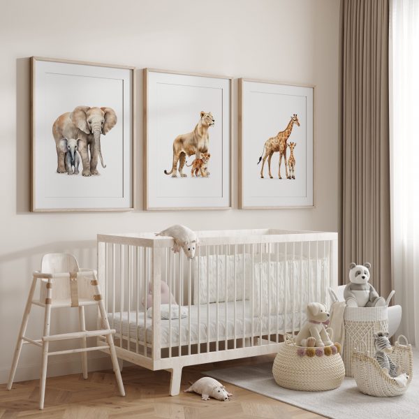 Transform your nursery or playroom into a whimsical safari wonderland with this set of three watercolour safari animal print illustrations! These adorable nursery animal mum and baby pictures feature lions, giraffes, elephants, zebras, monkies and meerkats adding a touch of charm and adventure to your little one’s space. Perfect for a gender-neutral nursery or a playful playroom, these jungle animal posters are sure to spark imagination and creativity. Each print is lovingly handcrafted, making them a unique and special addition to any child’s room. Bring the magic of the wild into your home with these delightful safari nursery wall art prints!