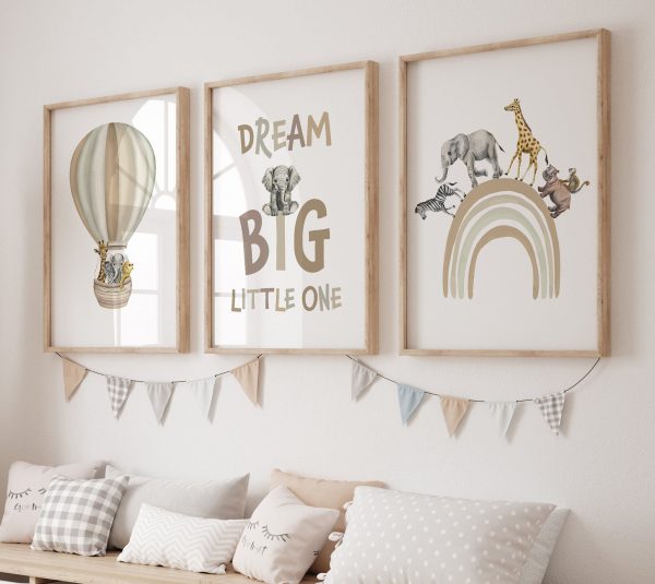 Full of Character Set of 3 Dream Big Little One safari animal prints, rainbow and hot air balloon.
