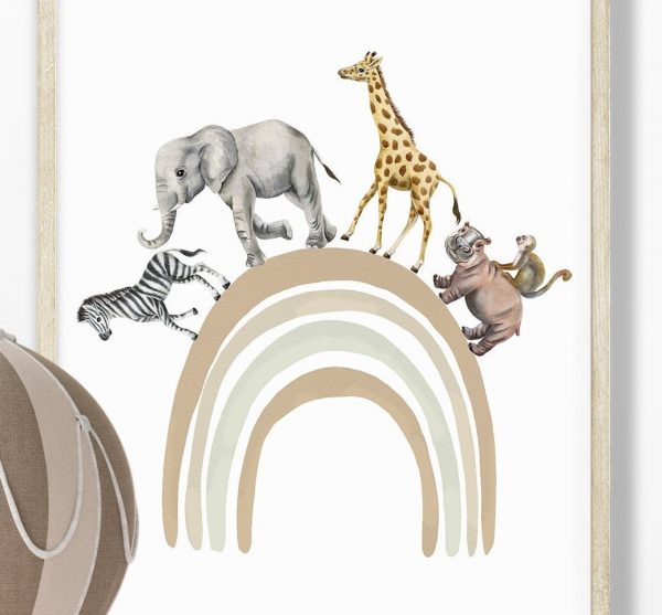 These safari animal Hand Drawn watercolour print set of two features illustrations of fun safari animals, zerba; lion; elephant and giraffe going on an adventure in a beige hot air balloon. A neutral coloured rainbow with safari friends zebra; elephant; giraffe; hippo and cheeky money going on a rainbow walk. The neutral shade of colours used to create these fun nursery prints makes this set a perfect choice for baby boy’s nursery, Girl’s Nursery, toddlers bedroom or playroom. The rainbow and hot air balloon colours are customisable… If you would like alternative colours, please reach out and will be happy to accommodate.