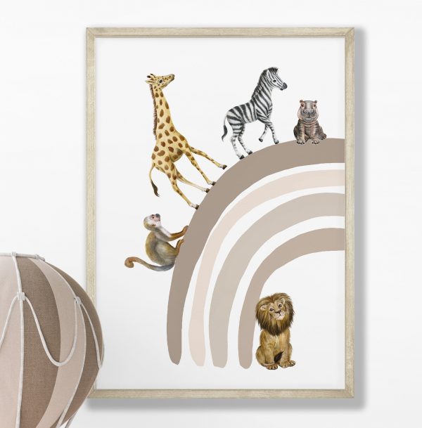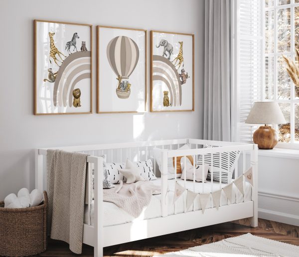 Add a touch of whimsy and adventure to your nursery with this Safari Animal Prints Set of 3 in a charming Neutral Beige Rainbow safari theme. These Neutral Nursery Posters are perfect for adding a playful Boho touch to your little one’s space. Featuring a combination of beloved safari animals including elephant, giraffe, zebra, monkey, lion, lioness, and hippo, this set also includes a delightful hot air balloon beige print with giraffe, lion, zebra, and elephant in the basket. Create a Safari neutral Rainbow Nursery Decor that sparks imagination and joy with these beautifully illustrated prints. Perfect for both boys and girls, these posters will be a delightful addition to your nursery decor.