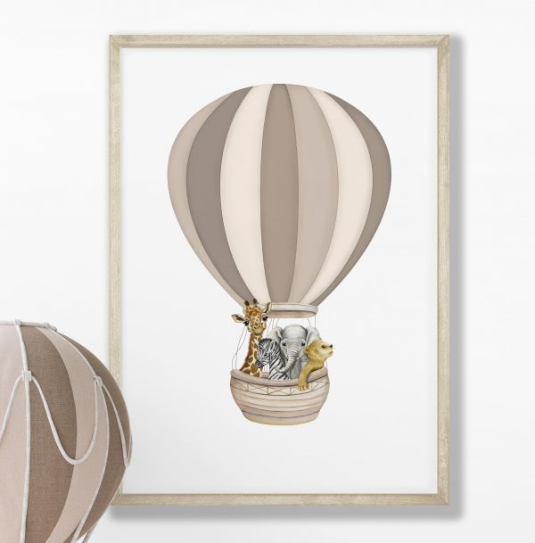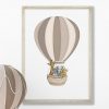 Neutral Beige Rainbow Safari Nursery Prints – Hot Air Balloon Art with Safari Animals