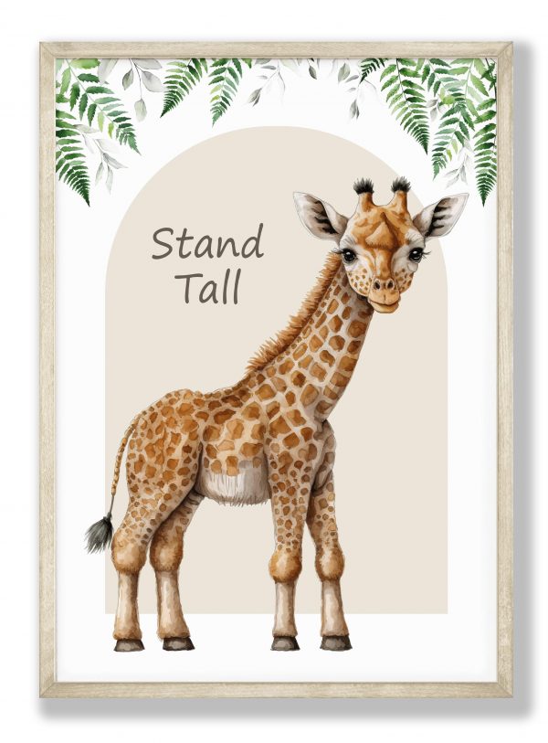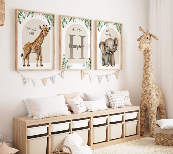 Transform your little one’s nursery or playroom into a whimsical safari wonderland with this charming set of 3 prints featuring a playful elephant, elegant giraffe personalised with little one’s initial and name. Perfect for a baby boy’s nursery or a baby girl’s room, these neutral wall art pictures in soothing shades of beige will add a touch of serenity and style to any space. Each print is lovingly crafted to inspire imagination and create a cosy atmosphere for your little explorer to thrive in. Each print includes the inspirational quote “Stand tall, dream big”, making them not only decorative but also motivational. Elevate your decor with these adorable animal prints and make your child’s space truly special.