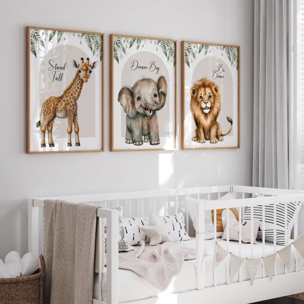 Transform your little one’s nursery or playroom into a whimsical safari wonderland with this charming set of 3 prints featuring a playful elephant, elegant giraffe, and majestic lion. Perfect for a baby boy’s nursery or a baby girl’s room, playroom, toddler bedroom these safari animal wall art pictures with a choice of 5 backdrop colours in soothing shades of beige, sage cool, sage warm, soft grey and soft pink will add a touch of serenity and style to any space. Each print is lovingly crafted to inspire imagination and create a cosy atmosphere for your little explorer to thrive in. Each print includes the inspirational quote “Stand tall, be brave, dream big”, making them not only decorative but also motivational. Elevate your decor with these adorable animal prints and make your child’s space truly special.