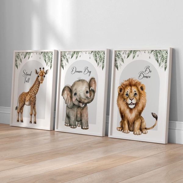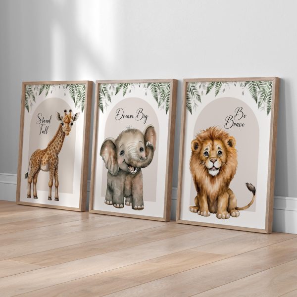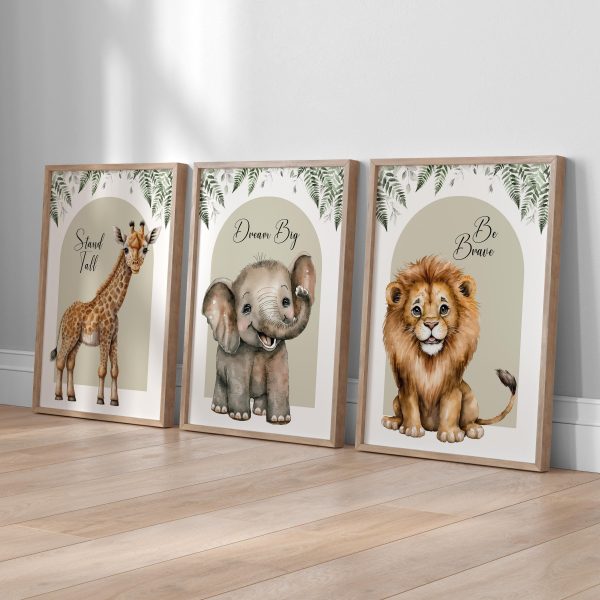 Transform your little one’s nursery or playroom into a whimsical safari wonderland with this charming set of 3 prints featuring a playful elephant, elegant giraffe, and majestic lion. Perfect for a baby boy’s nursery or a baby girl’s room, these safari animal wall art pictures with a choice of 5 backdrop colours in soothing shades of beige, sage cool, sage warm, soft grey and soft pink will add a touch of serenity and style to any space. Each print is lovingly crafted to inspire imagination and create a cosy atmosphere for your little explorer to thrive in. Each print includes the inspirational quote “Stand tall, be brave, dream big”, making them not only decorative but also motivational. Elevate your decor with these adorable animal prints and make your child’s space truly special.